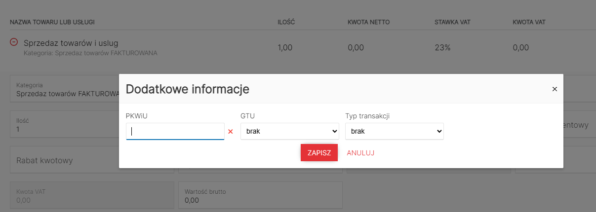 - uzupełnić kod PKWiU, GTU oraz typ transakcji (jeśli nie dotyczą - wybierz opcję brak, pole PKWiU pozostaw puste),
