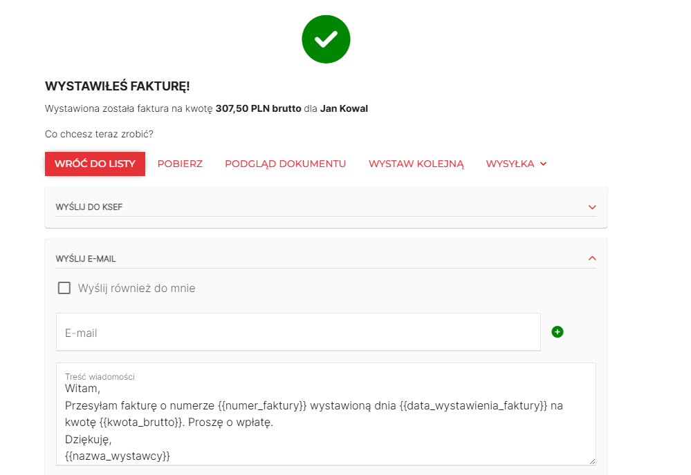 Po wystawieniu faktury otrzymasz komunikat sukcesu z informacją, że wystawiłeś fakturę.