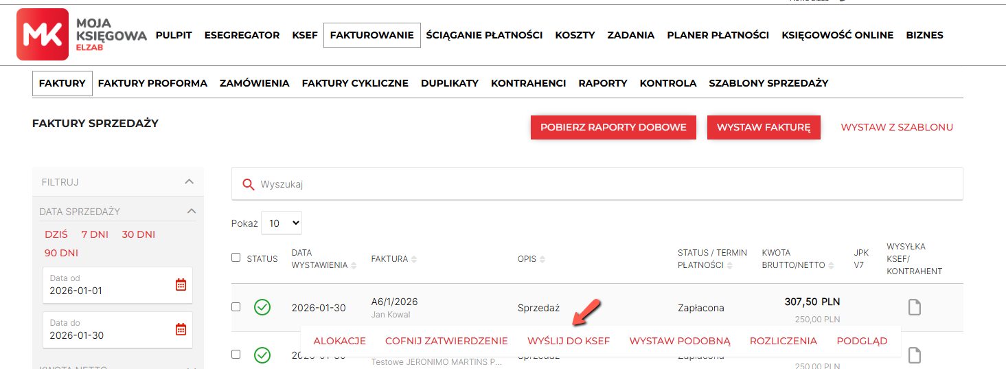 Ponownie przejdź do zakładki Fakturowanie/Faktury, z której będziesz mógł również dokonać wysyłki faktury do Krajowego Systemu e-Faktur po nakierowaniu kursorem na dokument i wybraniu opcji Wyślij do KSeF.